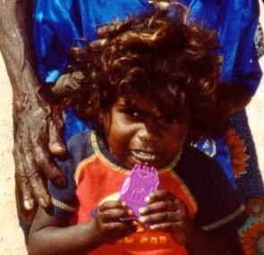 Finite le abluzioni tornammo indietro verso Nord per la prossima tappa: il villaggio aborigeno di Manyallaluk. Per raggiungerlo lasciammo la strada principale per dirigersi verso linterno del bush, bisognava percorrere varie decine di Km di strada non asfaltata per arrivare presso un centro dove a pagamento gli aborigeni spiegavano alcuni aspetti della loro cultura ma purtroppo dopo una decina di chilometri un cartello mi bloccò: chiuso il Sabato e la Domenica ed era Domenica !Tornati un po delusi sulla strada principale mi fermai a fare benzina e comperare un po di acqua. Quando tornai vidi Maria che parlava con una donna aborigena. La cosa mi sorprese molto in quanto soprattutto in queste zone avevo spesso visto aborigeni vagare per la città e non mi sembravano affatto inclini a prendere confidenza ! Infatti in generale non mi sbagliavo ma quando si viaggia con i bambini si ha una marcia in più nei confronti dei locali (ma non solo), un pas-partout per fraternizzare: capita infatti spesso che la gente vedendo Maeva abbatta quel muro di diffidenza che normalmente si ha con lo straniero. Questa mamma aborigena infatti stava scambiando con Maria complimenti e commenti in uno stentato inglese sui rispettivi bambini non solo ma fatto rarissimo volle fare con noi una foto (gli aborigeni odiano farsi fotografare) chiamando tutti i bambini che trovava, anche quelli non suoi. Più triste fu il dopo, quando chiedendole lindirizzo dove poterle spedire la foto non riuscì a dirmelo semplicemente non lo sapeva. A questo proposito ci portò da alcuni suoi amici seduti in una aiuola sulla strada, poi da altri appoggiati ad un muretto e da altri ancora ma tutti ci rispondevano che sapevano fisicamente dove abitavano ma non sapevano dirci lindirizzo alla fine ci dissero di spedirla a Katherine città senza indirizzo (ovviamente la cosa era assurda!).