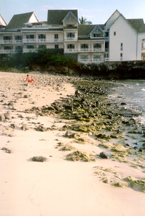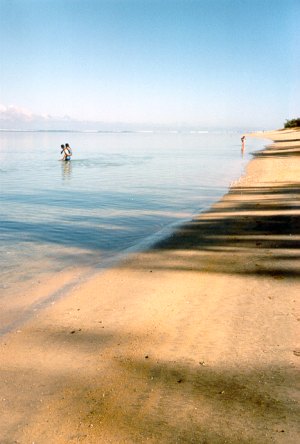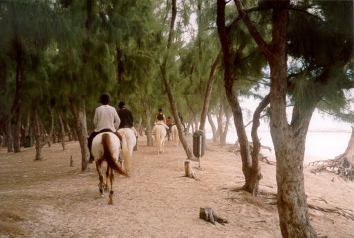 Continuando verso Sud, scavalcando (via terra) la scogliera di Boucan Canot, incontriamo la spiaggia di Roches Noires (rocce nere) il cui nome descrive il luogo, poi la spiaggia del camping Sedre (non la conosco) fino ad arrivare alla laguna (e spiaggia) dell’Hermitage. Ovviamente questa è la spiaggia che ho frequentato maggiormente sia perchè è quella a due passi dall’albergo e sia perchè secondo me è la migliore dell’isola. Passo alla descrizione: la riva è formata da sabbia chiara frammista di pezzetti di corallo. Si tratta come tutte le spiagge di un luogo pubblico ed è frequentato soprattutto dalle famiglie con bimbi grazie alla protezione della barriera corallina (in francese: récif, in inglese: reef) che assicura acqua piatta e bassa in ogni momento dell’anno con ogni condizione di tempo. Addirittura nelle giornate senza vento, quando le maree sono meno forti, il mare è talmente immobile che la superficie esterna riflette il boschetto immediatamente dietro il litorale (come in un laghetto alpino) mentre sott’acqua vengono riflessi verso l’alto i coralli ed i pesci. Durante invece le giornate di vento (non frequenti ma possibili con vento proveniente da sempre Sud in questo lato dell’isola) oppure quando il mare è in tempesta si possono creare occasionalmente delle correnti in alcuni tratti della laguna che però non creano mai grandi problemi grazie al fatto che comunque il mare resta calmo e la profondità è costante intorno al metro. Quando il vento incomincia a dare fastidio (può durare qualche ora ma non è giornaliero) basta arretrate di un metro all’interno del boschetto per avere la calma assoluta. Il boschetto , molto comune anche in altre spiagge dell’Ovest (ma non solo) è formato da Filaos (nome Francese) ovvero da Casuarina equisetifolia (il corrispettivo dell’albero del ferro Polinesiano) una pianta comune ai tropici dall’aspetto di un pino ma dai legni molto più duri tanto da non galleggiare. E’ ovviamente meta sia per il riparo dal vento che da quello del sole (sempre potente a queste latitudini) degli amanti del pic-nic e la mattina presto degli appassionati del jogging e dell’equitazione (e tappa fissa del dopo-colazione di mia figlia). Sono stato in questa spiaggia sia di Domenica che a Ferragosto, ovvero nei giorni di punta delle gite e durante il periodo di ferie lavorative e scolastiche e nonostante le abbondanti auto parcheggiate lungo la strada (non asfaltata) devo dire che mai la spiaggia è stata affollata e rispetto a Boucan Canot la consiglio per il relax…ovviamente in tutta l’isola non ci sono stabilimenti balneari e all’Hermitage neanche attività commerciali-turistiche ad esclusione di un chiosco-bar e di un pittoresco carretto dei gelati e ovviamente ad esclusione degli hotel (nella parte interna) sempre molto discreti e tranquilli: leggi senza animazione o attività tipiche dei villaggi organizzati che come ho detto a Reunion per fortuna non esistono. Le uniche attività di svago (quando e solo se presenti) all’interno degli hotel sono tutte serali ed a tema tipo: danze e canti Segà e Maloya, musica contemporanea soprattutto blues, proiezione diapositive, dimostrazioni ed esposizioni/vendita di prodotti tipici, corsi di cucina creola (buonissima, leggermente speziata, un mix di cucina africana, araba ed orientale ingentilita da un pizzico di europeismo e Maeva compatibile).Tornando alla descrizione dell’Hermitage (comune anche alla spiaggia limitrofa di Saline les Bains che si trova nella medesima laguna), vorrei aggiungere che si tratta di un arenile lungo diversi chilometri con una laguna che si estende dalla costa alla barriera per parecchie centinaia di metri (più di un chilometro in alcuni punti) formato da mare poco profondo (mediamente un metro).