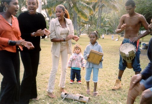 Ricordo un giorno a Grand Anse, una spiaggia del Sud-Ovest protetta dalla montagna dai venti ma non dai capricci dell’Oceano, che un gruppo di giovanissimi creoli si sono piazzati su un praticello ed hanno iniziato ad intonare un Africanissimo motivo Segà. In poco tempo hanno tirato fuori una botte a mò di tamburo (Houleur), un triangolo, uno strumento formato da canne di bambù e semi (Le Kayamb, di origine indiana) ed hanno iniziare a cantare e ballare. Hanno continuato per ore senza che nessuno badasse a loro tranne noi che affascinati siamo rimasti ad ascoltarli ed ad applaudirli finop a sera; persino la nostra Maeva è stata presa per mano e coinvolta. Non si trattava di un’esibizione a scopo di lucro ma semplicemente un modo per passare del tempo allegramente tra amici.