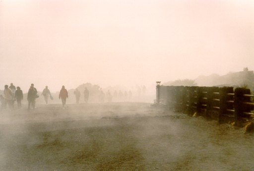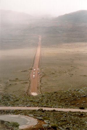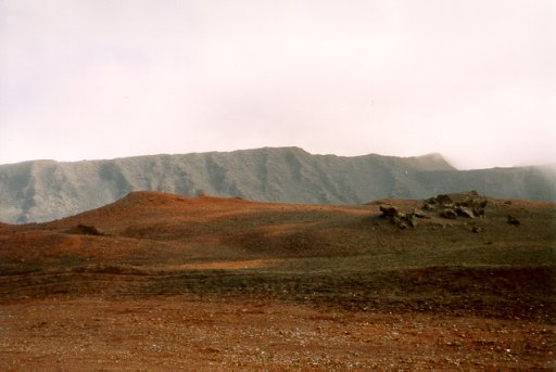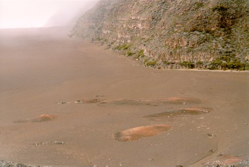 Poi raggiunto il bordo della vecchia caldera si ridiscende con una serie di tornanti in basso (lungo la strada vari punti panoramici dove fermarsi e con un pò di fortuna fotografare “le formiche” ovvero piccoli coni vulcanici raggiungibili anche a piedi) sino a Plaine des Sables, un vero e proprio deserto di sabbia lavica che con le nebbie, il freddo e la desolazione assume un aspetto spettrale ma accattivante…sembra di stare sulla Luna, o meglio su Marte visto i colori tendenti al rosso. Da questo punto la strada non è più asfaltata e continua tra le nebbie verso il Pas de Bellecombe (attenzione: sono possibili in questa zona piogge anche nella stagione “buona”) dove c’è un punto panoramico raggiungibile facendo una deviazione sulla strada principale. Ritornando sulla strada principale (principale si fa per dire: poco più di un viottolo tortuoso di terra battuta/fangosa) si arriva infine alla meta a quasi 2650 metri: il bordo della caldera principale.Se si è fortunati con la visibilità e si è bene protetti dai rigori del freddo, umidità/pioggia e vento (meglio mettersi un k-way sopra il maglione) si può parcheggiare l’auto e sporgendosi da un parapetto vedere il cono del vulcano, se invece si è più temerari sulla sinistra (guardando la caldera) c’è una stradina percorribile a piedi che in qualche ora porta direttamente all’interno del vulcano (ovviamente se non è in attività). Accanto al parapetto ci sono anche un paio di cannocchiali ed un piccolo chiosco dove prendere una cioccolata calda e/o usufruire dei servizi igienici; il vulcano attivo è l’unico luogo che per motivi di sicurezza non ha punti attrezzati al pic-nic.