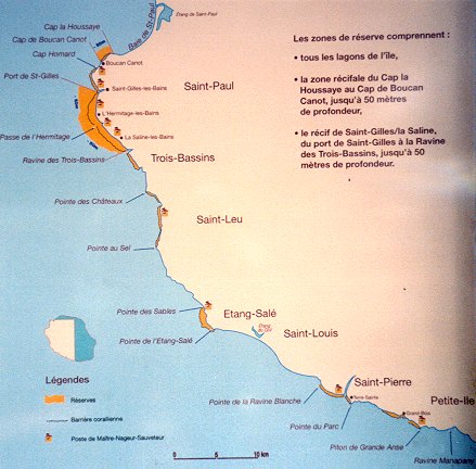 Avvertenze marine: restare vicino riva nelle spiagge non protette dalla barriera per evitare di essere trascinati a largo dalle forti e pericolose correnti e per non imbattersi in un grande squalo tigre, toro o mako oppure meno frequentemente in uno squalo bianco o martello. Per lo stesso motivo è sconsigliabile nuotare nelle spiagge protette oltre il reef se non in escursione organizzata da professionisti. La Réunion ha il più alto rapporto di attacchi di squalo/decessi del mondo (58% contro una media mondiale del 10-12%) ed ogni anno uno o due bagnanti subiscono un’aggressione ad una distanza media dalla riva di 35m con un fondale di 4,5m…vedi anche i seguenti link (mappa), link (statistiche).