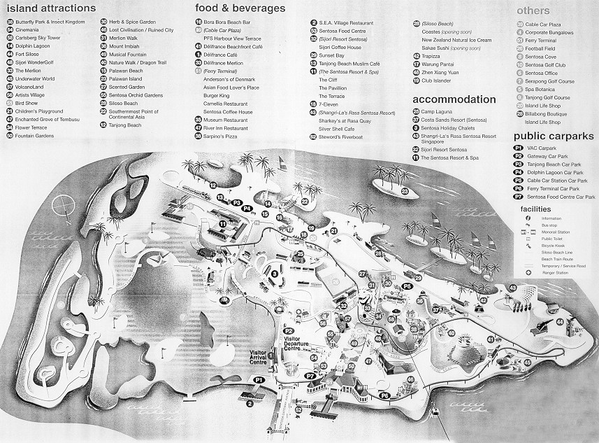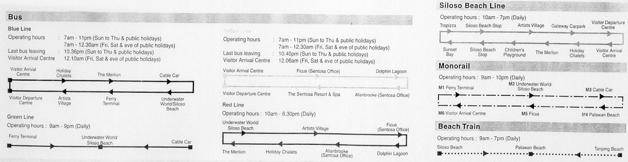 Lisola di Sentosa fu veramente piacevole da scoprire anche perché facile da girare in autonomia con una micro-cartina in mano (qui ne ho scannerizzata una) utilizzando i mezzi pubblici gratuiti. Ovviamente anche questi mezzi erano intonati al bizzarro ambiente disneyano; infatti ad esclusione di qualche tradizionale bus rosso il resto dei trasporti erano formati da improbabili trenini composti dai soliti trattori camuffati, assurdi autobus colorati da Luna Park e dalla monorotaia.La monorotaia correva per tutta lisola e a prima vista dava limpressione di qualcosa di avveniristico in realtà anche se molto comoda in termini di percorso (tocca quasi tutti i luoghi più importanti e abbinata ad un bus permette di arrivare ovunque) era un trabiccolo di legno per niente confortevole, traballante, lento, semi-aperto, senza aria condizionata ed assomigliava più ad una giostra di paese (addirittura di notte guarnita dai tubi di lucette simili a quelle delle feste rionali) che ad un moderno servizio pubblico però era senzaltro un mezzo suggestivo e panoramico… meno male che non pioveva !
