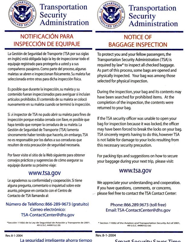 ogni caso l’avvenuta ispezione è segnalata da un foglio lasciato all’interno della valigia.