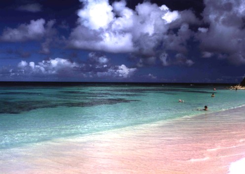 Dato che è una follia non godersi un posto del genere, al mattino ci alziamo presto (molto prima di quanto io non faccia quando vado al lavoro) e alle 8.30 abbiamo già fatto colazione e siamo già nella magnifica spiaggia. Anche Carla e Lelio sono mattinieri per cui li ritroviamo pronti per la prima giornata di mare. La particolarità di Barbuda è che il mare porta sulla sabbia delle minuscole conchiglie rosa che le conferiscono appunto un caratteristico bel colore rosato, più marcato in certe zone e meno in altre in cui invece rimane bianca. Con un paesaggio del genere e con una così splendida giornata è un peccato rimanere ad oziare su un lettino per cui decidiamo di andare a fare una passeggiata e ci avviamo verso nord dove pare che la spiaggia si sviluppi ininterrottamente per decine di chilometri. La spiaggia è davvero un sogno ad occhi aperti: larga, stupenda e, soprattutto, deserta.