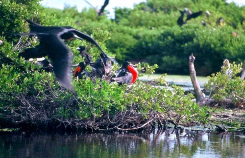 E’ arrivato ormai l’ultimo giorno, purtroppo, (a Barbuda saremmo rimasti volentieri qualche giorno in più) e al mattino io, Stefano ed i signori di Vercelli andiamo in escursione alla palude di mangrovie, che si trova nella laguna interna, per poi raggiungere il luogo in cui si trovano le fregate. Infatti a Barbuda vive la più grande colonia stanziale di fregate dei Caraibi (e non, come ha scritto qualche mostro di cultura sul sito di TpC, “passano di lì tra una migrazione e l’altra”… ho riso per un mese!!!!). Ogni anno migliaia di fregate nidificano proprio nella mangrovie della laguna. La gita è, al solito, parecchio costosa ma abbiamo voglia di fare qualcosa di diverso e, soprattutto, di vedere le fregate. Raggiungiamo il paese di Codrington e con una piccola barca veloce ci inoltriamo tra le mangrovie.