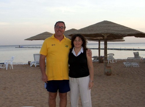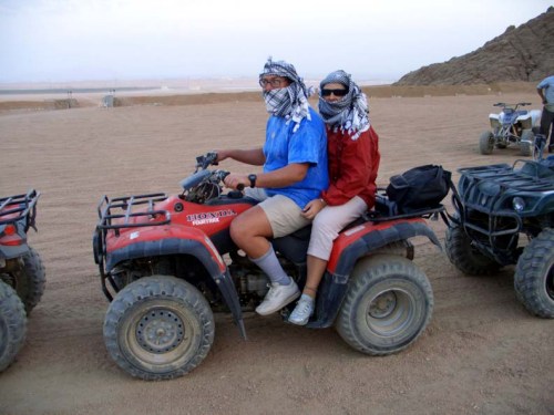 Torniamo al corso sub, lasciata Paola a godersi una mezza giornata rilassante sulla spiaggia, mi accingo con un po di timore e tanta curiosità a iniziare il mio corso. Andrea il capo diving Achille e Nicola si dimostrano subito molto preparati e disponibili, Andrea tiene i primi rudimenti teorici, molto interessanti e poi calziamo la muta completa, pinne, maschera e bombola (non lavevo mai fatto, che fatica!!!) e ci immergiamo in piscina bassa per la prima lezione pratica e qui iniziano un po di problemi per me, ma con laiuto paziente di Nicola in particolar modo (grazie) e Andrea mentre Achille curava di più un gruppo di 3 tedeschi, riesco lentamente a superarli, anche se non credo di aver ancora del tutto appreso la tecnica di togliersi lerogatore sottacqua per poi rimetterlo. Finiamo la mattinata con un filmato seguito da una breve prova teorica scritta e prendo 9/10. Soddisfatto, rientro con Antonio, un collega di corso al Blu Conrad, dispiaciuto di non poter proseguire il corso il pomeriggio perché abbiamo in programma la motorata nel deserto. Dopo il solito gradevole pranzo ci prepariamo alla motorata; lappuntamento è alle 15:00 alla Hall del villaggio. Siamo in molti, più di 30 e manca Antonio con sua moglie, mi aveva assicurato che ci sarebbe stato, avrà preferito portarsi avanti col corso Sub. Partiamo con 20 di ritardo col pulmino del Conrad verso il luogo del noleggio delle moto a 4 ruote motrici. E qui è un bailamme, moto vecchie e insufficienti per tutti, confusione e inadeguatezza dei locali, per fortuna cè Michael che con il suo dinamismo riesce a farci partire alle 16.15. Abbiamo almeno 45 di ritardo sulla tabella di marcia, le moto sono una vera schifezza, la mia ha le convergenze a pezzi e sbanda continuamente verso sx, alcune sono rotte nel telaio, altre nel motore tantè che qualcuno di noi rimane a piedi. Però inoltrandoci nel deserto, nonostante un traffico esagerato di queste moto (ovviamente di altri resort) latmosfera magica un po ci pervade e dopo una sosta inutile in una discoteca, ci dicono sorta dal nulla pochi anni fa, ci godiamo un bel tramonto sempre viaggiando in colonna, ma ci perdiamo la Valle dellEco, intasata da altri motoristi e finiamo per prendere il famoso the nel deserto in una tenda beduina. È un momento molto toccante, siamo sdraiati sui loro tappeti e ci viene servito dopo poco uno squisito the arabo. Dopo la sosta e le foto di rito in quellatmosfera così particolare, rientriamo (nella confusione a me e Paola e toccata unaltra moto che non tiene il minimo, per cui al minimo va avanti da sola, va forte e i freni praticamente non esistono, con qualche preghiera rientriamo al luogo del noleggio e poi in albergo un po stanchi. Doccia e via per la cena. Dopo cena andiamo ad assistere allo spettacolo di cabaret dellequipe di animazione. Se sarà bello come quello della sera precedente, il divertimento è assicurato. In effetti lo spettacolo è stato carino, non bello (secondo me) come quello della sera precedente, ma sicuramente godibile, cera pure lopzione per chi desiderava, di continuare la serata notturno nel locale di Smaila, qua a Sharm, ma noi non abbiamo aderito e abbiamo scelto per il riposo.