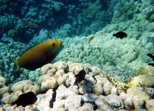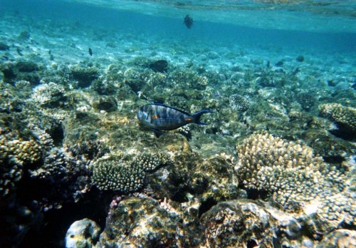 Alla mattina ci svegliamo di buon ora, ma pur non essendo dei pigroni, nessuno di noi due si decideva a scendere un po perché avevamo sentito ululare il vento di notte e un po perché lidea di immergerci in una giornata fredda proprio non ci allettava. Ma alla fine vinciamo la pigrizia e pronti via a fare colazione nel bel ristorante della sera prima e già dai primi passi, alle 8:30, assaporiamo un bel tepore che ci accompagna lungo il cammino. Finita colazione ci fondiamo in spiaggia, che per altro è lì vicino e recuperiamo dagli addetti, i teli mare e trovato un ombrellone ci apprestiamo a iniziare la nostra 1^ giornata di spiaggia. Io che notoriamente non resisto molto sdraiato al sole vado in riva al mare attirato dallacqua particolarmente limpida anche a riva e immergo i piedi per tastarla: oddio un sobbalzo mi prende: è molto fredda, la prima sensazione è quella di aver messo un piede dentro il ghiaccio, infatti a riva in acqua non cera nessuno; ma tantè sono cocciuto e non mi arrendo, percorro il pontile galleggiante e arrivo al punto dimmersione per lo snorkelling, cè in acqua una sola ragazza inglese, che snorkella tranquillamente senza muta vicino al pontile e comunica coi suoi genitori che sono sopra vicino a me, che ha appena visto una tartaruga e io non resistendo alla curiosità le chiedo di che dimensioni è, mi fa segno con la mano un cerchio di circa 50 cm di diametro: incuriosito decido di buttarmi anchio anche se non ho la maschera e la prima sensazione è che lacqua sia fredda, ma non come a riva, giro un po nel punto che mi ha indicato, ma ovviamente senza maschera non la vedo per niente. Torno a riva comunque contento per comunicare a Paola che sì, con un po di coraggio, si può fare il bagno. Paola ha portato da casa una mezza muta che indossa, io ho solo un giubbetto (di quelli che i sub usano sotto la muta per le immersioni profonde), indossatolo anchio partiamo decisi e ci immergiamo dal pontile con maschera e pinne. Uno spettacolo sublime si apre ai nostri occhi, pesci multicolori e di varie forme e un giardino di corallo in cui campeggiano regalmente coralli cervello, alcionari rossi, rosa e verdastri, pesci pagliaccio, picasso, damigelle, pesci trombetta di varie dimensioni, 1 pesce leone e piccoli coloratissimi altri pesciolini e vediamo più tardi anche dei carangidi e delle grosse cernie. A me è sembrato anche di vedere due squaletti grigi da barriera che si sono allontanati in fretta, ma non ne sono del tutto sicuro. Snokelliamo per quasi un ora felici e allunisono con quel mondo meraviglioso silenzioso e maestoso allo stesso tempo. Rientriamo in tempo per provare una cosa che ha sempre desiderato limmersione, ma non ho mai fatto. Ce nè una di prova organizzato dal locale padi, proviamo sia io che Paola, ma lei rinuncia perché non si sente sicura, ha un po di timore, che ho anchio, ma che cerco di controllare e una volta superati un po di problemi con lerogatore mi lascio guidare dal sub che mi prende letteralmente di peso e mi fa fare un giro di prova. La sensazione è bellissima, anche se mi sembra di essere un pacchetto trasportato a dx e sx sopra e sotto. Ma la cosa mi piace e decido di iscrivermi al corso di due giorni che si terrà il Lunedì e il Martedì successivi. Dopo pranzo, un po di relax al caldo sole (finalmente) e poi continuiamo a snorkellare, finendo rapidamente la prima delle tre macchine fotografiche sub usa e getta. Lo spettacolo è sempre incantevole, affascinante e ti invita a proseguire sia che vai a dx, sia che vai a sx della barriera, ogni tanto non mancano i punti particolarmente freddi, ma per fortuna sono pochi.