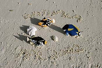 A Bathala, la barriera corallina e’ comodissima: non occorre, come invece nel caso di altri atolli, farsi portare per le immersioni al largo con le barche… e’ sufficiente infilare maschera e pinne e tuffarsi nelle splendide acque cristalline subito sotto il bungalow: la barriera e’ proprio tutto intorno all’ isola!!! Cosi’ si puo’ fare snorkelling in ogni momento della giornata, senza essere vincolati a nessuno! Ed il mare e’ ovviamente la cosa piu’ bella delle Maldive… quante ore abbiamo passato a mollo durante questa purtroppo breve settimana!! Quanti incontri emozionanti, quanti incredibili colori! Tartarughe, squali nutrice, trigoni e poi ancora decine e decine di pesci chirurgo dall’ affilata pinna superiore, pesci trombetta che scivolano leggeri appena sotto la superficie , pesci pagliaccio dal simpatico musetto, pesci orientali dallo spettacolare corpicino tigrato e mille altri di cui neppure conosco il nome. Nuotare in mezzo a loro e’ stata un’ esperienza indimenticabile… ci hanno letteralmente fatto sentire pesci come loro, poiche’ non temevano affatto la nostra presenza e ci tolleravano alla stregua di grossi pesci innocui!! Ricordiamo in modo particolare il silenzio che regnava in tutto quel blu, rotto soltanto dal rumore un po’ metallico dei dentini dei pesci contro i coralli su cui trovano nutrimento.