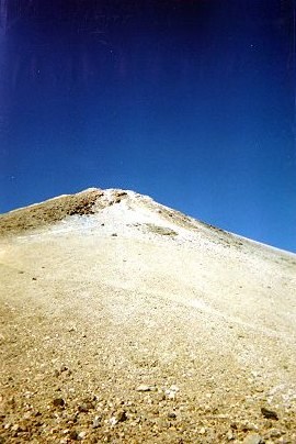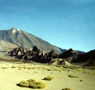 Durante la salita, ormai superata la pineta, ci sono i tipici cespugli, uniche piante che resistono perchè riescono isolarsi dal freddo della notte e a non far evaporare acqua durante il giorno, grazie alla particolare forma che ne isola la parte interna. Il vulcano che si vede sulla sinistra è il Teide. La punta bianca non è neve, ma pomice, quindi si deduce che il Teide è un vulcano esplosivo come il Vesuvio , al contrario dell’Etna (colate di lava basaltica). La pomice ( che deriva dalla solidificazione delle nuvole incandescenti delle esplosioni vulcaniche) si trova un po’ ovunque in zone anche più a bassa quota, insieme anche all’ ossidiana, una pietra nera vetrosa, che i popoli indigeni delle Canarie che vivevano prima della colonizzazione usavano anche per creare attrezzi. La neve sul vulcano comunque si ferma, ma solo d’ inverno.