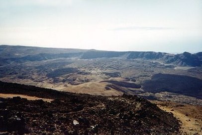 Questo è il vecchio cratere, ed ha un diametro di circa 18 Km. Qui ormai ci crescono anche le piante e la bocca attiva è spostate più in alto. Questa foto praticamente è stata scattata dalle parti di quella formazione rocciosa che si vede in lontananza nella prima foto, in quanto per raggiungerla si passa proprio dentro al cratere, che è tutto pianeggiante…naturalmente in mezzo ai commenti generali, tipo “adesso scoppia”, ” metti che decide di eruttare adesso”, ecc. ecc.