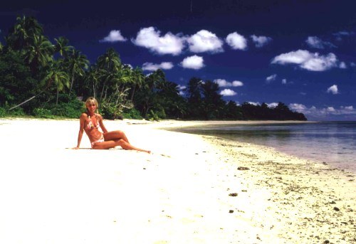 Appena atterriamo la banda inizia a suonare per accogliere il re con i dovuti onori. Anche noi dobbiamo scendere per reimbarcarci pochi minuti dopo, la destinazione questa volta è finalmente la nostra: le Ha’apai. Non appena ci siamo accomodati, arriva l’hostess che (su segnalazione dei piloti) invita uno di noi due ad accomodarsi nella cabina di pilotaggio. Inutile dire che è Stefano il fortunato e può così farsi tutto il volo vicino ai piloti e scoprire così un po’ di segreti. Innanzitutto al momento del decollo entrambi i piloti tengono contemporaneamente la mano sulla leva che comanda lo “stacco” da terra. Subito dopo uno di loro legge un foglio con tutte le procedure di volo e l’altro controlla che sia tutto in ordine. Dopodiché, a decollo avanzato, il volo prosegue con l’inserimento del pilota automatico che viene disinserito quando inizia la fase di discesa. Dopo soli 20 minuti finalmente siamo arrivati. Jürgen, il marito di Sigrid ci sta già aspettando. Sono loro i padroni del Sandy Beach Resort. La coppia è tedesca e sono entrambi, a dir poco, delle persone deliziose: efficienti, affabili, simpatici, ti mettono subito a tuo agio, sembra di essere in una famiglia. Raggiungiamo il resort dopo circa 15 minuti di auto. Il Sandy Beach è composto da 12 bei bungalow Sandy Beach in muratura, arredati bene, in modo funzionale ed elegante. Tutta la struttura fa un’ottima impressione di ordine e pulizia. I bungalow si affacciano su una splendida immensa spiaggia piena di coralli e conchiglie. Proprio un posto incantevole, aveva ragione Steve ;-). Sigrid ci sta aspettando e ci accoglie con affetto: ci presenta subito l’unica coppia di Italiani presente al Sandy (ed è anche la prima coppia di Italiani che incontriamo durante tutta la vacanza, dato che alle Fiji non ne avevamo trovati): Marcella e Alberto sono due ingegneri (anche loro!) di Torino e, fortunatamente, sono due persone gentili e simpatiche. Sigrid ci da’ un po’ di informazioni sugli orari della colazione e della cena e ci illustra il funzionamento del resort: ci mostra dove si trovano la canoe di libero uso, ci spiega che dalla spiaggia è consentito prendere sia conchiglie che coralli, ma che è proibito prelevare qualsiasi cosa viva dal mare, ovviamente. Veniamo accompagnati al nostro fare (bungalow, in tongano) che si chiama Tolu (3 in tongano): la stanza è molto grande e ben arredata e una grande finestra chiusa solo da una zanzariera da’ sulla veranda. Disfiamo velocemente le valigie e ci fiondiamo a passeggiare in spiaggia, io ne approfitto per raccogliere delle bellissime conchiglie. La cena è fantastica, (noi siamo allo stesso tavolo con i due ingegneri torinesi perché Sigrid accorpa le persone per nazionalità in maniera tale che si possano scambiare due chiacchiere): dopo un antipasto di verdure ci viene servita una bella aragosta! Dopo cena ci si siede tutti fuori davanti al mare a chiacchierare con Sigrid e Jürgen. Come dicevo, i proprietari fanno di tutto per mettere le persone a proprio agio e per favorire la socializzazione, tra le persone dello stesso stato prima e tra persone di paesi diversi poi. Infatti l’atmosfera familiare che si è venuta a creare, a noi è piaciuta moltissimo e rispecchia in pieno la nostra idea di come deve essere la vita in un resort, noi che rifuggiamo e detestiamo i vari Viva Club, Bravo Club, Club Mediterranee ecc. ecc.! Andiamo a dormire stanchissimi ma felici: dopo le privazioni delle Kadavu ci voleva davvero un bel posto, e la costa inconcepibile è che al Sandy Beach si spende al giorno più o meno la stessa cifra che ci spennavano al Waisalima!!! Sandy Beach In realtà alle Tonga non c’è molta scelta per quanto riguarda i posti in cui alloggiare, perché ci sono pochissime strutture di livello discreto adatte alla mentalità di noi Europei che teniamo alla pulizia. Queste strutture sono tutte gestite da stranieri perché, ci hanno detto, quelle gestite dai Tongani hanno in genere i servizi igienici in comune e una pulizia piuttosto scarsa. Fortunatamente però le poche strutture buone hanno prezzi onesti, non si spendono certo le cifre astronomiche che vengono chieste in Polinesia Francese per strutture con pari requisiti.